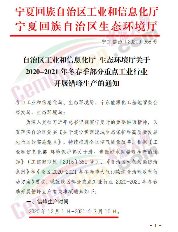 1.组织制定错峰生产实施方案。各市工业和信息化局、生态环境局要联合制定本市的水泥熟料企业错峰生产实施方案(见附件),明确错峰生产企业清单及停窑时间节点,实行台账管理,确保清单可操作性、可查询。并在11月27日(星期五)前分别报自治区工信厅、生态环境厅,公示公告后实施。2.建立错峰生产调度制度。各市工信部门要按照行业管理职责,建立错峰生产工作调度制度(自2020年12月起,各市每月6日前报上报上月错峰生产工作落实情况,直至错峰生产结束),随时掌握重点企业错峰生产动态,对错峰生产执行情况进行督促督导,及时协调解决错峰生产中出现的问题。3.强化监督检查。各市工业和信息化局、生态环境局要提前检查企业停窑准备工作情况,督促所辖企业按规定时间停窑,及时对辖区内水泥企业进行指导、监督和检查,12月1日要组成联合检查组到现场监督企业停窑,期间要不定时抽查停窑落实情况。必要时通过调取企业用电情况进行实时监控。生态环境部门要通过污染物排放在线监测平台,及时了解掌握企业错峰生产执行情况,组织开展冬季大气污染防治专项执法检查,依法查处超标排放,监测数据弄虚作假、违反排污许可证规定排放污染物的违法行为。要加大服务力度,协调督导各企业在错峰生产期间统筹做好设备检修、技术改造等工作,严格落实企业排放限值要求,有效降低供暖季大气污染,着力改善环境空气质量。要进一步畅通举报渠道,及时在门户网站上向社会公开电话、传真、电子邮箱、网络等多种举报渠道,对不执行行规行约、不守信不开展错峰生产的企业通过媒体公开曝光。4.严格责任追究。自治区工信厅、生态环境厅将不定期开展错峰生产执行情况和污染物达标排放的专项监督检查。对不执行行规行约,不守信不开展错峰生产的企业,必要时进行约谈;对拒不改正的企业由自治区工信厅核实后,在年度更新并公告的水泥熟料生产线清单中注明,限制其产能置换指标交易,并取消享受自治区工信厅的各类奖补政策,列入严重违法失信企业名单。自治区生态环境保护领导小组办公室将错峰生产执行情况纳入自治区党委督查室、政府督查室和冬春季大气攻坚行动下派工作组帮扶指导内容。原文如下: