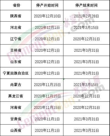 随着北方多区域进入采暖季,为避免与供热锅炉排放叠加污染,陕西,河北,内蒙古,辽宁,吉林,山东,甘肃,黑龙江,山西,河南等多区域相继发布水泥行业错峰生产通知。据水泥人网不完全统计, 河北、山东、辽宁、吉林、宁夏等多区域自12月1日起错峰停产,绝大多数区域将停产至2020年3月底。涉及水泥企业600多家。近期发布的各区域错峰生产时间表如下: