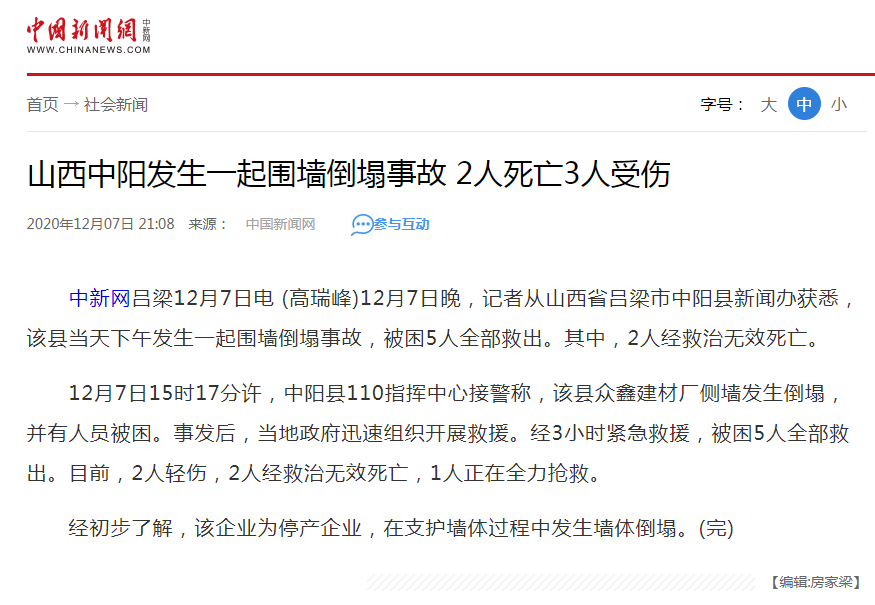 12月7日晚,记者从山西省吕梁市中阳县新闻办获悉,该县当天下午发生一起围墙倒塌事故,被困5人全部救出。其中,2人经救治无效死亡。