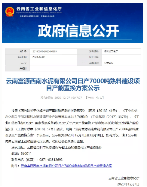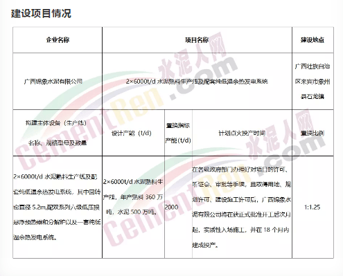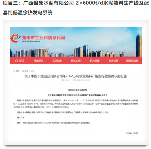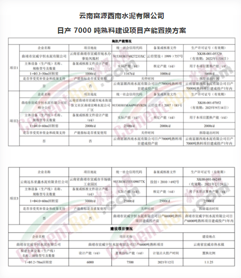 同期,河南省工信厅发布将湖波水泥年产30万吨新型干法水泥熟料产能将置换给湖南豪龙环保建材有限公司用于新建日产8000吨新型干法水泥熟料生产线(240万吨/年)。郑州市工信局发布公告将中国长城铝业有限公司年产62万吨通用水泥熟料生产线产能置换给广西锦象水泥有限公司,用于在广西壮族自治区来宾市象州县石龙镇境内新建两条6000t/d(360万吨/年)水泥熟料生产线,四个项目合计新建产能990万吨/年。项目一:云南富源西南水泥有限公司日产7000吨熟料建设项目新建生产线位于云南省富源县工业园区胜境片区设计产能7000t/d(关键设备为Φ5.4×72m回转窑一台)。置换指标产能8751t/d,置换比例1:1.25。计划点火时间2021年12月。详情如下: