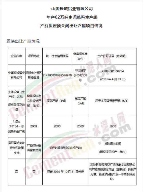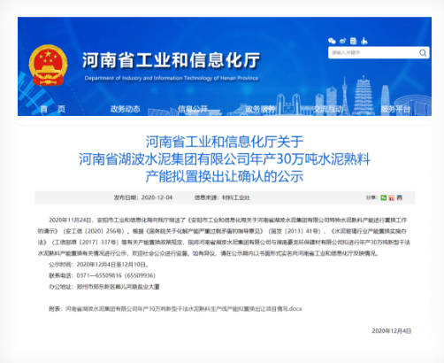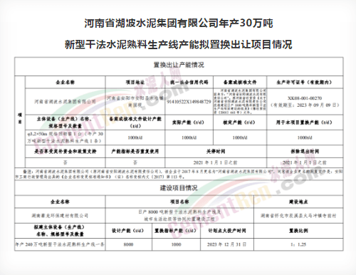 日前,河南省工业和信息化厅发布《关于河南省湖波水泥集团有限公司年产30万吨水泥熟料产能拟置换出让确认的公示》称,河南省湖波水泥集团有限公司将年产30万吨新型干法水泥熟料产能将置换给湖南豪龙环保建材有限公司用于在湖南省怀化市辰溪县火马冲镇寺前村境内新建日产8000吨新型干法水泥熟料生产线及城市生活垃圾等协同处置建设工程。置换比例为1:1.25,并将于2023年12月31日建成投产。