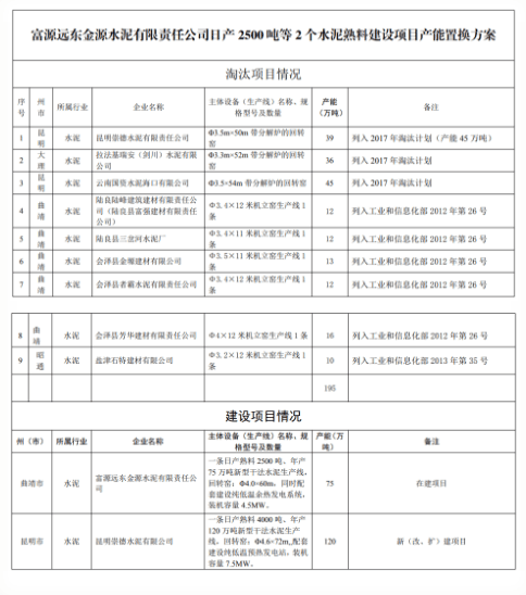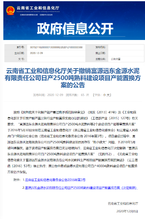 日前,云南省工信厅发布《关于撤销富源远东金源水泥有限责任公司日产2500吨熟料建设项目产能置换方案的公告》提到,富源远东金源水泥有限责任公司日产2500吨熟料建设项目因存在“批小建大”问题,于2018年5月被叫停整改。鉴于该项目产能置换方案已无法继续执行,云南省工业和信息化厅决定撤销“富源远东金源水泥有限责任公司日产2500吨熟料建设项目产能置换方案”。公告原文如下: