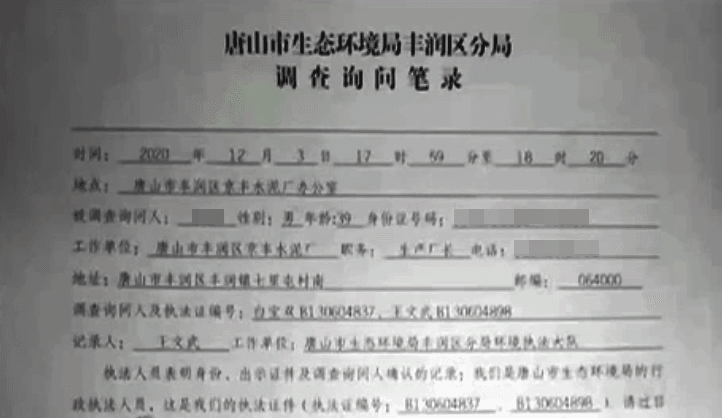 日前,河北省唐山市生态环境局夜查丰润区京丰水泥厂,发现有生产迹象和环境污染问题后,遭到该企业人员尾随、跟踪、阻碍,并辱骂环保执法人员。