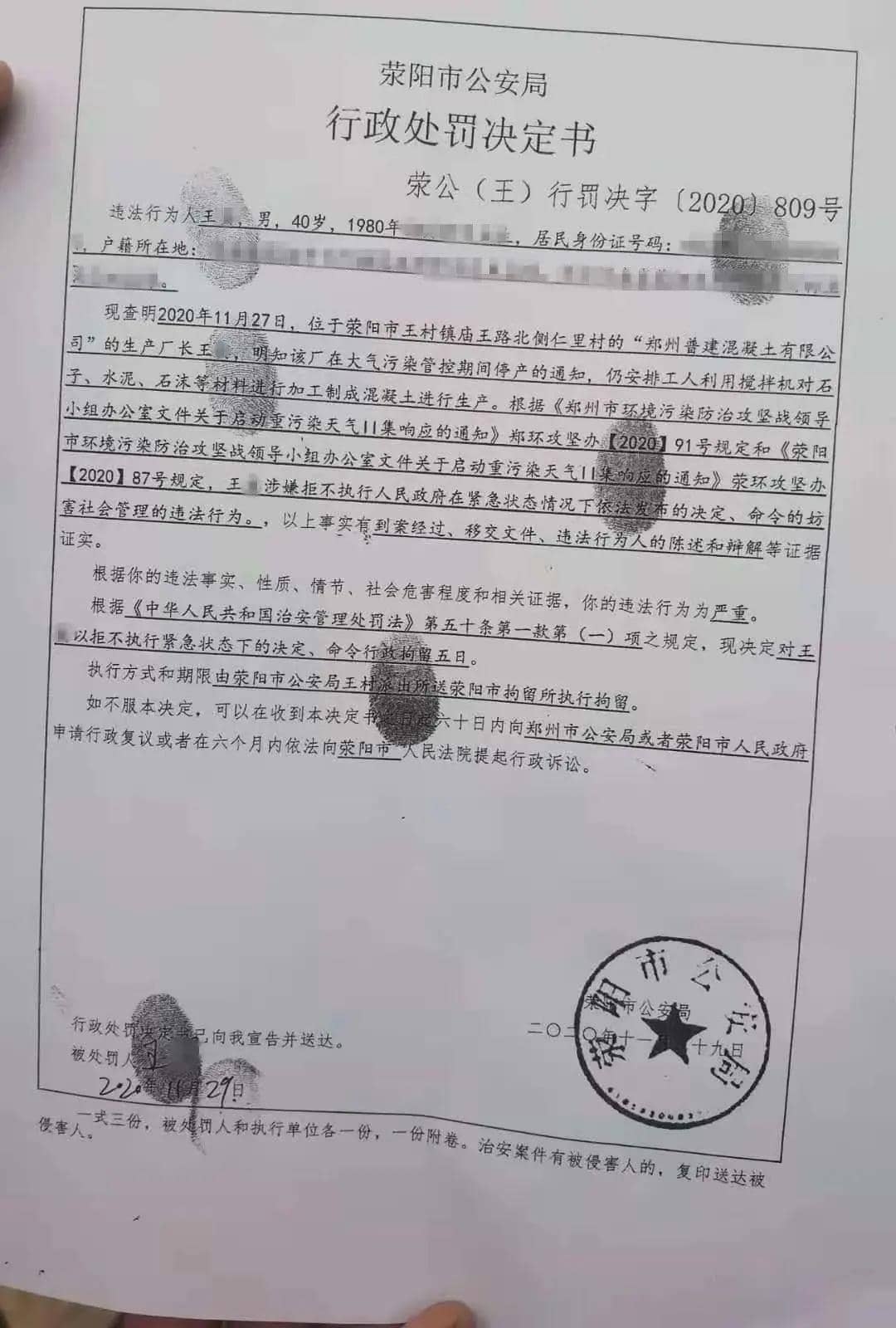早在10月份,唐山丰润区冀龙水泥有限公司、唐山市丰润区顺鑫水泥有限公司、唐山金达水泥厂等多家企业因未执行唐山市启动的重污染天气Ⅱ级预警应急响应减排措施。涉嫌环境违法分别被处以7万元罚款,企业生产负责人也被处以行政拘留处罚。11月23日至12月2日,河南郑州市持续对全市工业企业和建筑工地进行全方位督查,经督导组和公安部门核查,对5家未落实大气污染管控措施、违法生产施工的单位负责人作出了拘留处罚决定。其中包括一家混凝土公司。 11月27日,位于荥阳市王村镇仁里村的郑州普建混凝土有限公司,未按照重污染天气橙色预警管控要求,违反管控违规开启混凝土搅拌生产线进行生产,荥阳市生态环境局监察大队王村中队执法人员发现问题后第一时间赶到现场进行调查取证,将相关问题移交给当地公安机关,目前该企业实际经营人已被处以行政拘留5日的处罚。