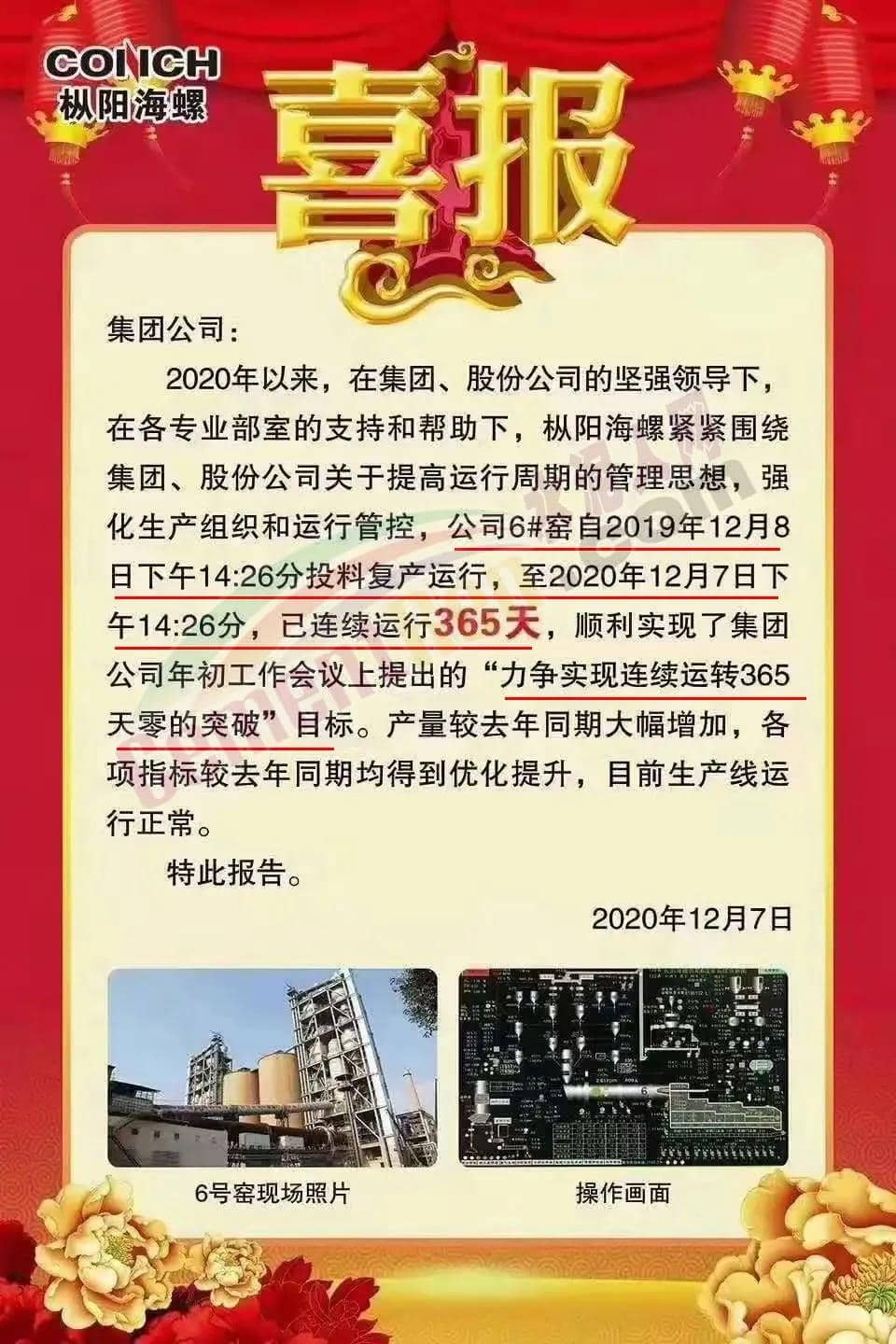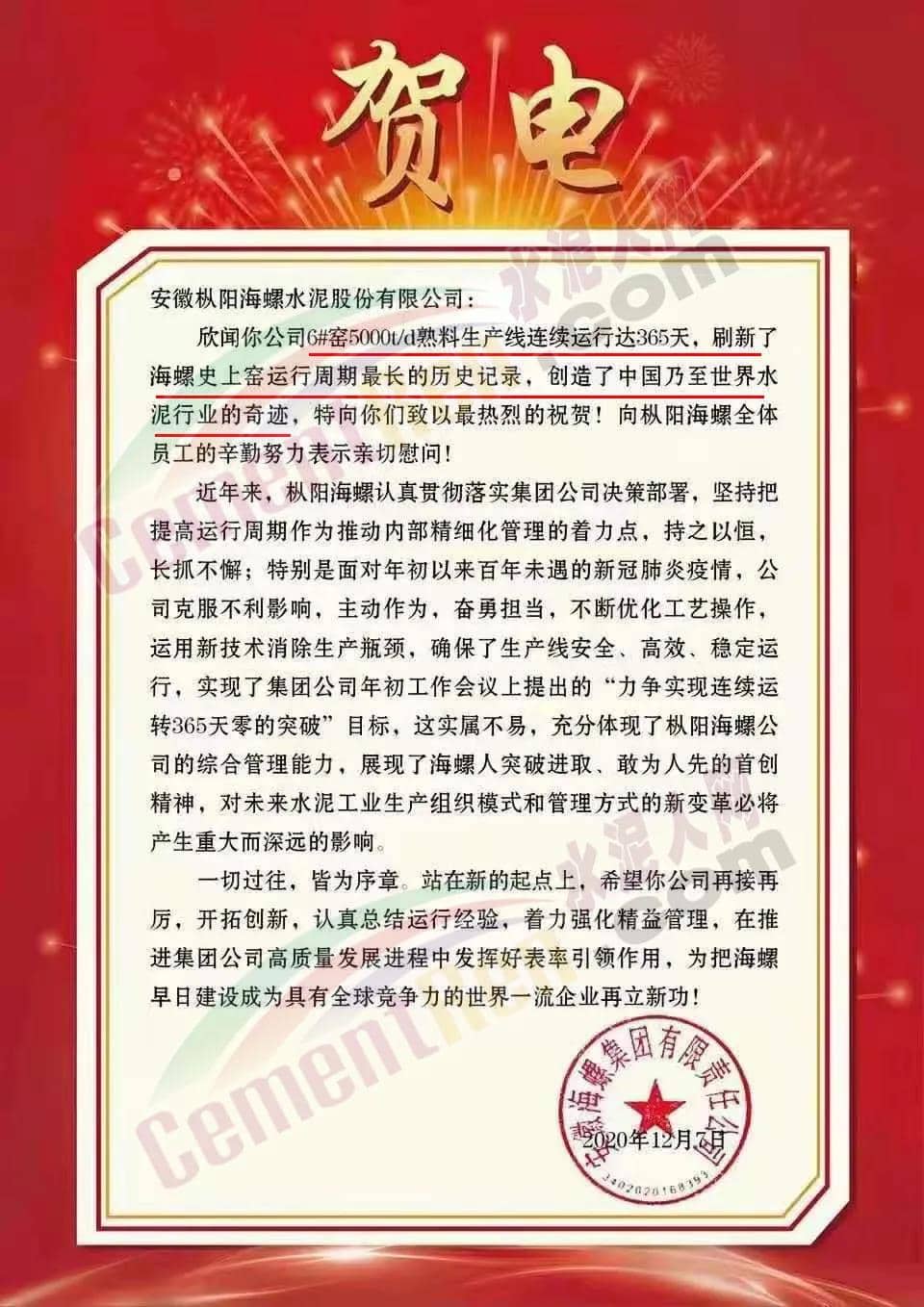 海螺集团的回函是回应此前水泥人网此前报道过的枞阳海螺给集团公司的《喜报》。12月7日,枞阳海螺向集团公司报喜称,2020年以来,在集团、股份公司的坚强领导下,在各专业部室的支持和帮助下,枞阳海螺紧紧围绕集团、股份公司关于提高运行周期的管理思想,强化生产组织和运行管控,公司6#窑自2019年12月8日下午14∶26分投料复产运行,至2020年12月7日下午14∶26分,已连续运行365天,顺利实现了集团公司年初工作会议上提出的"力争实现连续运转365天零的突破"目标。产量较去年同期大幅增加,各项指标较去年同期均得到优化提升,目前生产线运行正常。