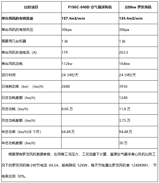 经测试:管道压力27KPa运行时(与罗茨风机管道压力相同),空气悬浮风机节能32.5%。1、同等工况运行时,空气悬浮风机比罗茨风机功率节能30%以上。2、空气悬浮风机引用高效叶轮直接连接功能,省去了中间传动装置,具有无机械接触、无振动、无需润滑、易于按装等特性,其噪声由原先110分贝降低到78分贝,远低于国家规定噪音限值80分贝,同时减少了对设备维护保养频率,节省润换系统使用的润换油,避免生产现场的二次污染等。