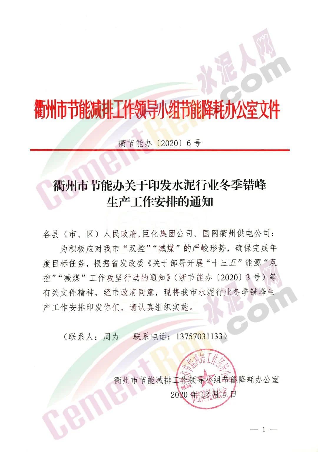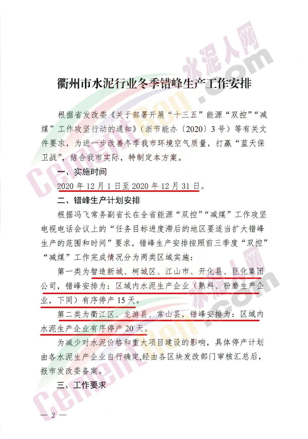 日前,浙江省衢州市节能喊排工作领导小组节能降耗办公室发布《衢州市水泥行业冬季错峰生产工作安排》,要求在2020年12月31日前,水泥生产企业实施错峰生产。第一类为智造新城、柯城区、江山市、开化县、巨化集团公司,错峰安排为,区域内水泥生产企业包括熟料和粉磨生产企业有序停产15天。第二类为衢江区、龙游县、常山县,错峰安排为,区域内水泥生产企业包括熟料和粉磨生产企业有序停产20天。通知原文如下: