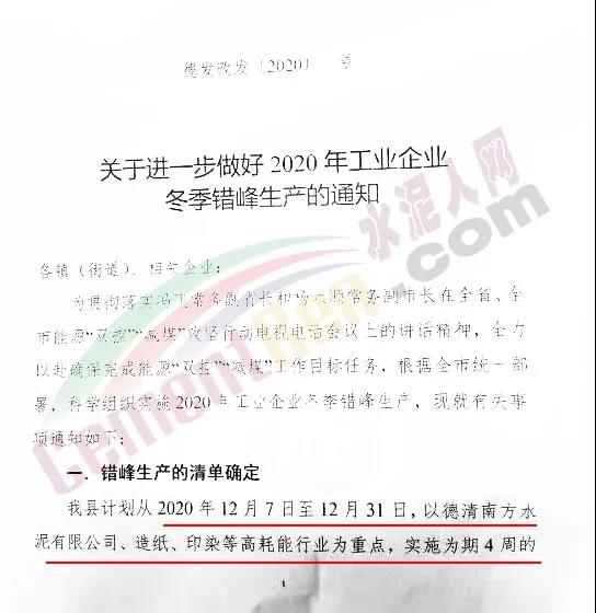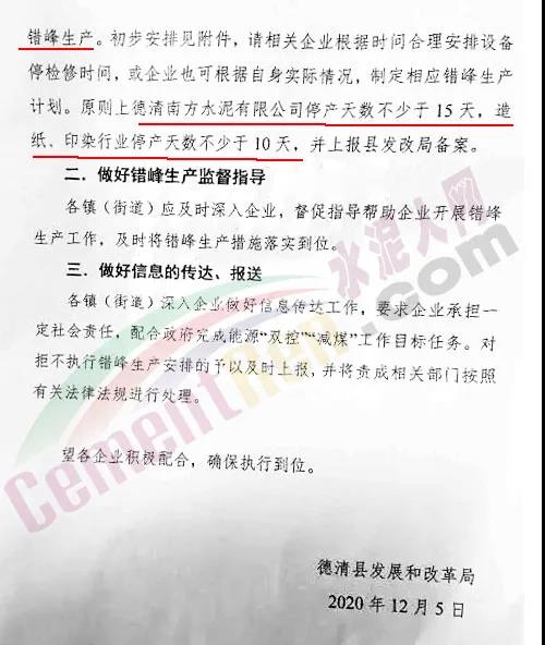 同期,浙江省湖州市德清县也发布了错峰生产通知。要求从2020年12月7日至12月31日,以德清南方水泥有限公司、造纸、印染等高耗能行业为重点,实施为期4周的错峰生产。其中提到,原则上德清南方水泥有限公司停产天数不少于15天,造纸、印染行业停产天数不少于10天,并上报县发改局备案。