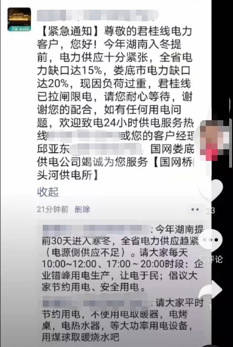 湖南衡阳祁东:从即日起,我县启动有序用电措施,在全县范围内将分线路、分批次进行轮流拉闸限电,最大限度保障用电供电工作有序运行。会议希望各用电企业、广大居民在每天上午10:00-12:00下午17:00-20:00高峰期错峰避峰用电,节约用电、安全用电。