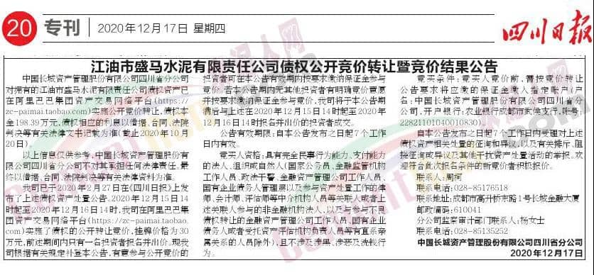 日前,四川日报发布了一则题为《江油市盛马水泥有限责任公司债权公开竞价转让暨竞价结果》的公告称,中国长城资产管理股份有限公司四川省分公司对拥有的江油市盛马水泥有限责任公司债权资产已在阿里巴巴集团资产交易网络平台实施公开竞价转让,债权本金198.39万元,债权相应的利息以借据、合同、法院判决等有关法律文书记载为准(截止2020年10月20日)。