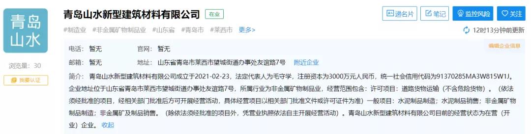 据查阅,山水新建成立于2021年2月23日,法定代表人为毛守学,注册资本为3000万元人民币。其经营范围包括水泥制品制造、水泥制品销售等。该公司目前由山水水泥持股100%。