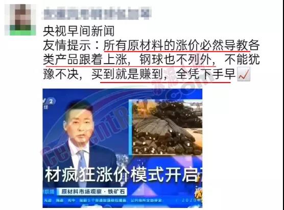 钢球厂家通知:所有材料的涨价必然导致各类产品跟着上涨,钢球也不例外,不能犹豫不绝,买到就是赚到,全凭下手早。如果这两天订货觉得贵了,不要慌再观察几天更贵,因为原材料又涨价了。