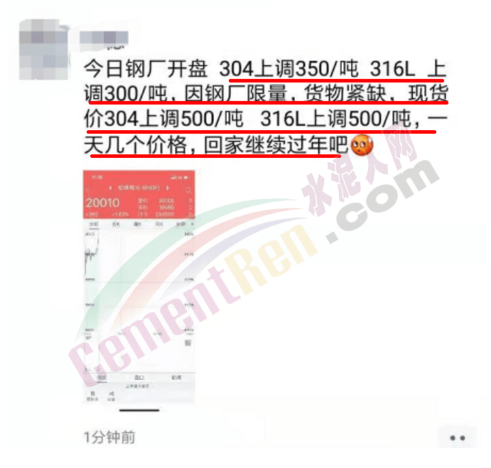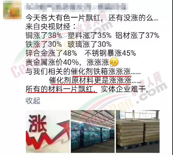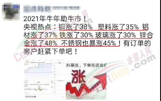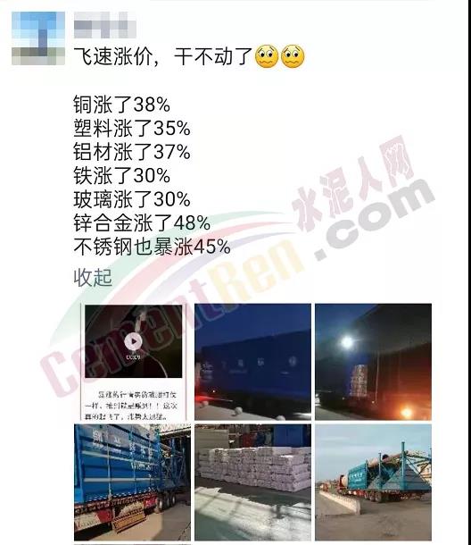 近日,水泥行业的上游供应商“炸锅了”,设备供应商“涨价函”满天飞,只因为:铜涨了38%、塑料涨了35%、铝材涨了37%、铁涨了30%、玻璃涨了30%、锌合金涨了48%、不锈钢也暴涨45%。