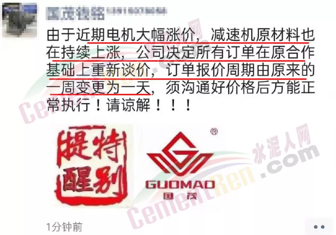 减速机厂家通知,由于近期电机大幅涨价,减速机原材料也在持续上涨,公司决定所有订 单 在原合作基础上重新谈价,订单报价周期由原来的一周变更为一天,须沟通好价格后方能正常执行!