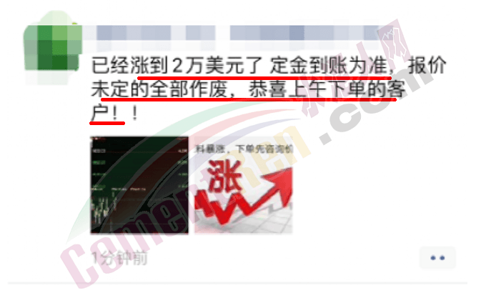 有企业发消息称,暴涨的行情卖货就跟打仗一样,抢到就是赚到!!这次真的起飞了,涨势太迅猛。销售人员提醒下单的抓点紧呀!开工4天涨4天,今天的高价就是明天的低价,恭喜昨天下单的客户!你还在犹豫吗?再不出手就只能拍大腿了!