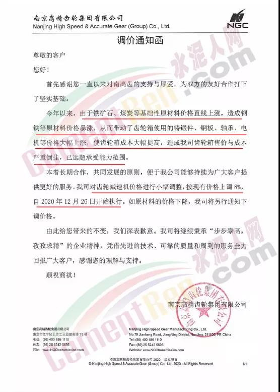 在刚刚过去的春节长假,大宗商品市场颇不平静,油脂类产品也出现大幅的大调。南京高精齿轮集团有限公司调价通知称,今年以来,由于铁矿石、煤炭等基础性原材料价格直线上涨,造成钢铁等原材料价格暴涨,从而带动了齿轮箱使用的铸锻件、钢板、轴承、电机等价格大幅上涨,使齿轮箱成本大幅提高,造成公司齿轮箱售价与成本严重倒挂,已远超承受能力范围。本着长期合作,共同发展的原则,便于公司能够持续为广大客户提供更好的服务。对齿轮减速机价格进行小幅调整,按现有价格上调8%,自2020年12月26日开始执行。如原材料的价格下降,将另行通知下调价格。