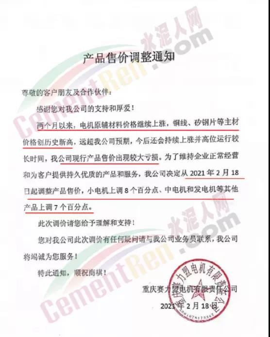 重庆赛力盟电机有限责任公司通知,两个月以来,电机原辅材料价格继续上涨,铜线、矽钢片等主材价格创历史新高,远超公司预期,今后还会持续上涨并高位运行较长时间,公司现行产品售价出现较大亏损。为了维持企业正常经营和为客户提供持久优质的产品和服务,决定从2021年2月18日起调整产品售价,小电机上调8个百分点、中电机和发电机等其他产品上调7个百分点。