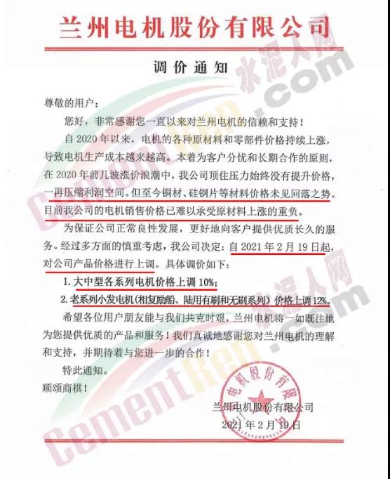 兰州电机股份有限公司调价通知称:自2020年以来,电机的各种原材料和零部件价格持续上涨,导致电机生产成本越来越高。本着为客户分忧和长期合作的原则,在2020年前几波涨价浪潮中,公司顶住压力始终没有提升价格,一再压缩利润空间。但至今铜材、硅钢片等材料价格未见回落之势。目前我公司的电机销售价格已难以承受原材料上涨的重负。