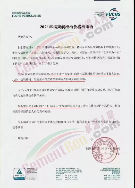 德国福斯油品集团2021年福斯润滑油价格沟通函提到,随着疫情的持续发展,全球工业严重受挫,润滑油原材料供给已经受到了极大影响。此外,包装耗材、运输成本等受政策影响也在持续大幅度增加。福斯中国将于2021年2月1日起正式实行新的价格方案。