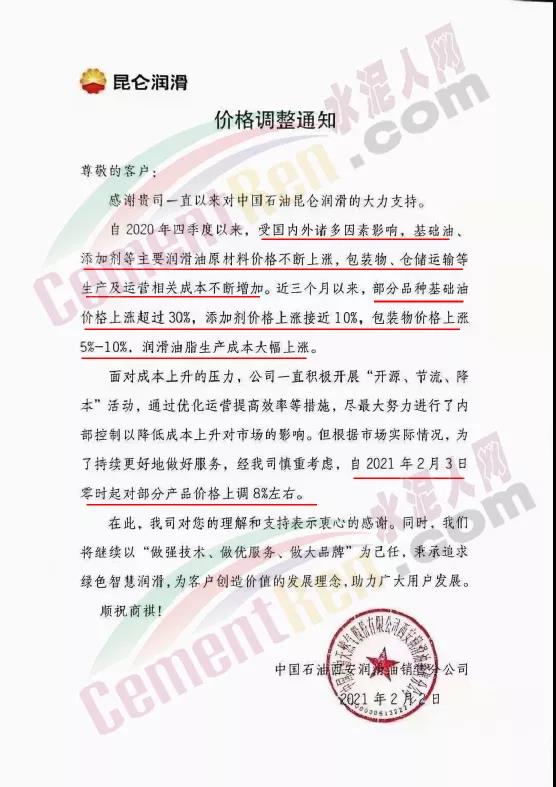 中国石油昆仑润滑通知,自2020年四季度以来,受国内外诸多因素影响,基础油、添加剂等主要润滑油原材料价格不断上涨,包装物、仓储运输等生产及运营相关成本不断增加。近三个月以来,部分品种基础油价格上涨超过30%,添加剂价格上涨接近10%,包装物价格上涨5%-10%,润滑油脂生产成本大幅上涨。经公司慎重考虑,自2021年2月3日零时起对部分产品价格上调8%左右。