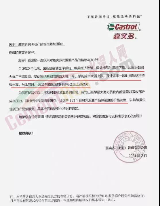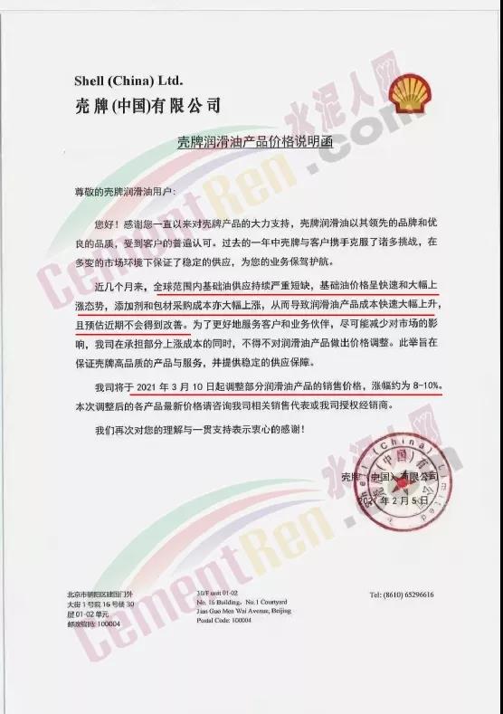 壳牌润滑油发产品价格说明函称,近几个月来,全球范围内基础油供应持续严重短缺,基础油价格呈快速和大幅上涨态势,添加剂和包材采购成本亦大幅上涨,从而导致润滑油产品成本快速大幅上升,且预估近期不会得到改善。为了更好地服务客户和业务伙伴,尽可能减少对市场的影响,公司在承担部分上涨成本的同时,不得不对润滑油产品做出价格调整。此举旨在保证壳牌高品质的产品与服务,并提供稳定的供应保障,公司将于2021年3月10日起调整部分润滑油产品的销售价格,涨幅约为8-10%。
