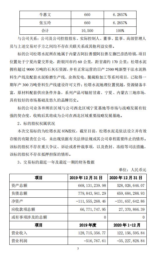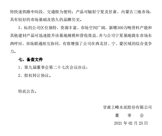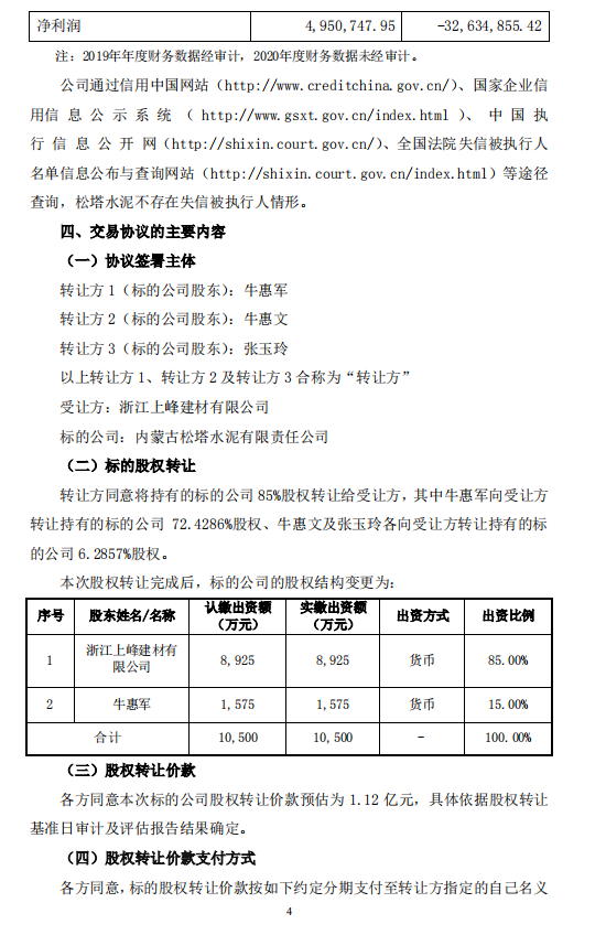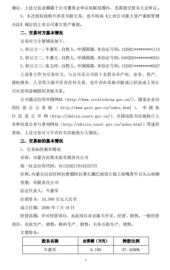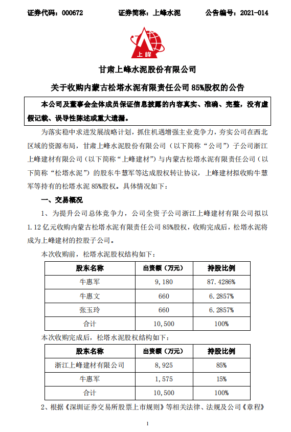 上峰水泥2月25日晚间发布公告称,为落实稳中求进发展战略计划,抓住机遇增强主业竞争力,夯实公司在西北区域的资源布局,甘肃上峰水泥股份有限公司子公司浙江上峰建材有限公司与内蒙古松塔水泥有限责任公司的股东牛慧军等达成股权转让协议,上峰建材拟以1.12 亿元收购牛慧军等持有的内蒙古松塔水泥有限责任公司85%股权。