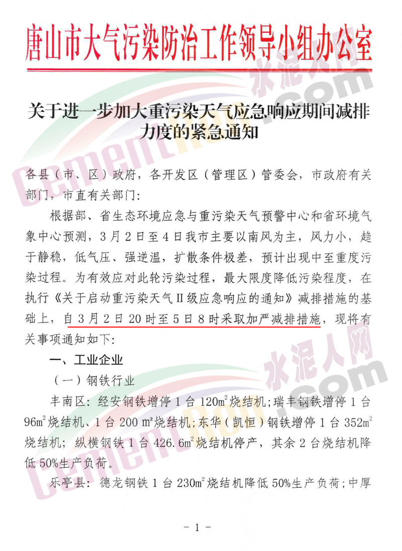 据水泥人网了解:日前,唐山市大气污染防治工作领导小组办公室发布《关于进一步加大重污染天气应急响应期间减排力度的紧急通知》称,根据部、省生态环境应急与重污染天气预警中心和省环境气象中心预测,3月2日至4日唐山市主要以南风为主,风力小,趋于静稳,低气压、强逆温,扩散条件极差,预计出现中至重度污染过程。