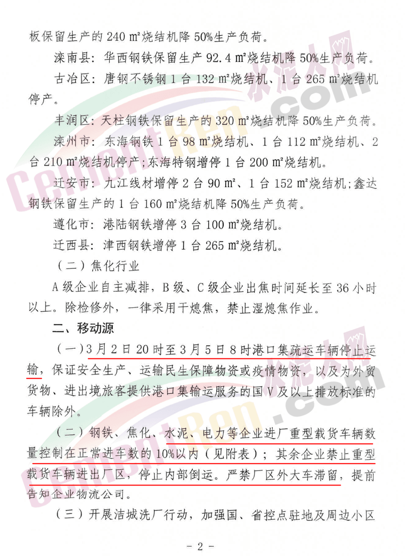 移动源:3月2日20时至3月5日8时港口集疏运车辆停止运输,保证安全生产、运输民生保障物资或疫情物资,以及为外贸货物、进出境旅客提供港口集输运服务的国V及以上排放标准的车辆除外。