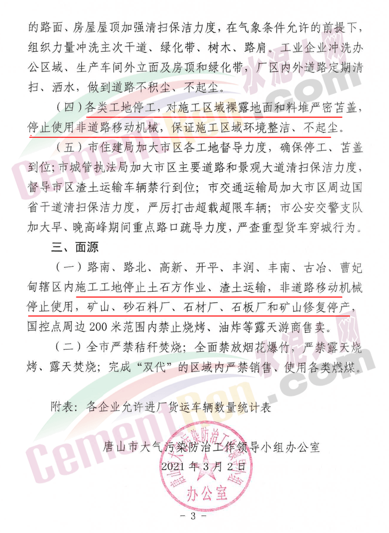 面源:路南、路北、高新、开平、丰润、丰南、古冶、曹妃甸辖区内施工工地停止土石方作业、渣土运输,非道路移动机械停止使用,矿山、砂石料厂、石材厂、石板厂和矿山修复停产。