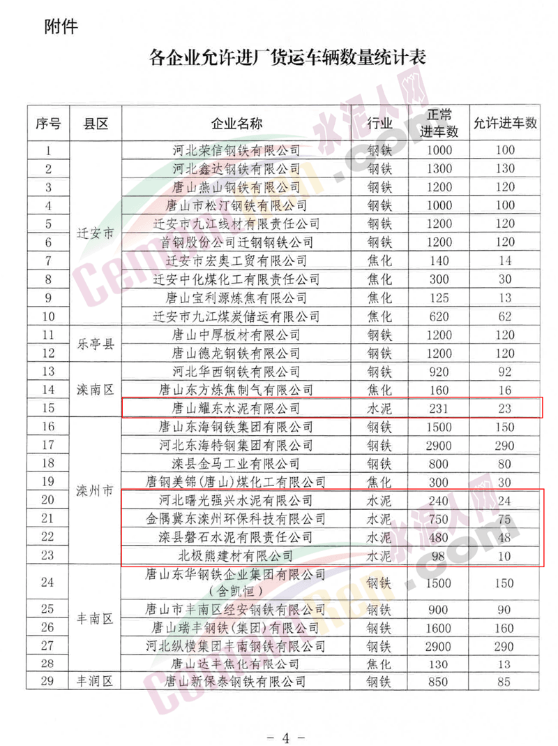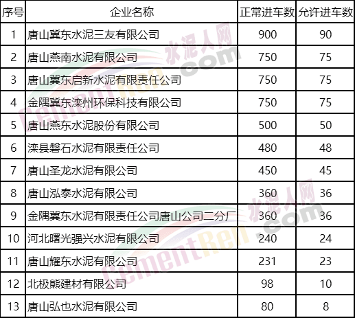 据水泥人网统计,共13家水泥企业正常进数量共5949辆,允许进车数仅595辆。