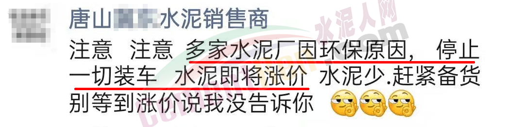 日前,唐山区域某水泥经销售商通知:“多家水泥厂因环保原因, 停止一切装车,水泥即将涨价... ...”