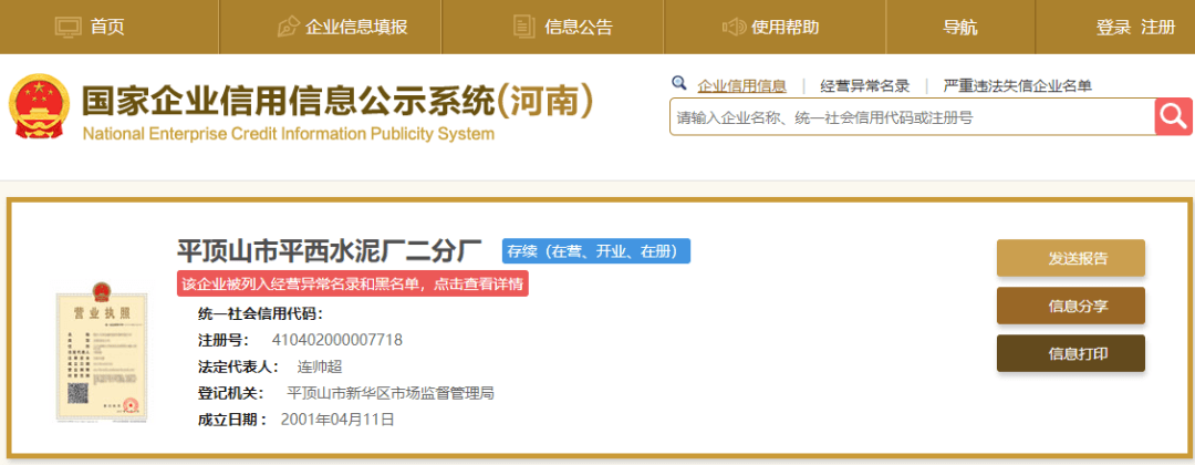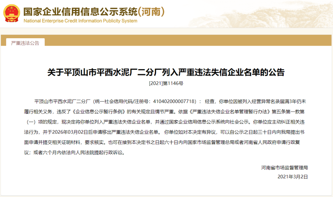日前,水泥人网从国家企业信用信息公示系统获悉,2021年3月2日,河南省市场监督管理局发布关于平顶山市平西水泥厂二分厂列入严重违法失信企业名单的公告([2021]第1146号)。