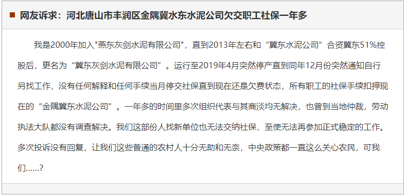 运行至2019年4月突然停产直到同年12月份突然通知自行另找工作,没有任何解释和任何手续当月停交社保直到现在还是欠费状态,所有职工的社保手续扣押现在的“金隅冀东水泥公司”。
