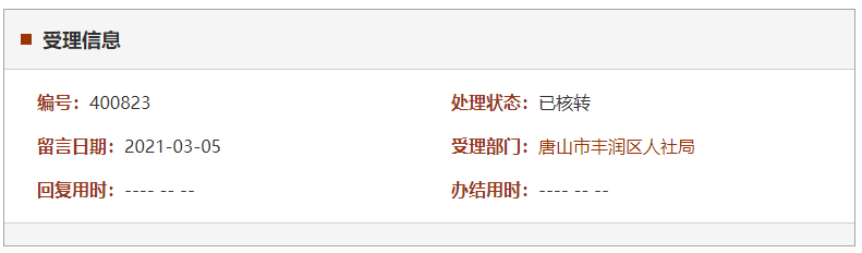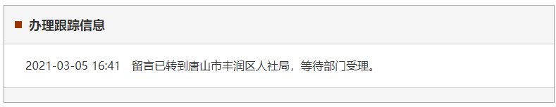 此留言处理状态为已核转,办理跟踪信息显示,2021年3月5日 16:41留言已转到唐山市丰润区人社局,等待部门受理。