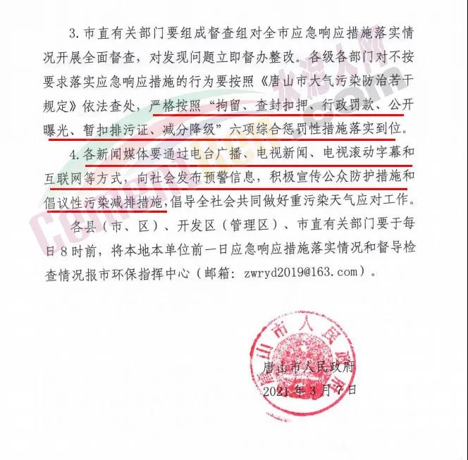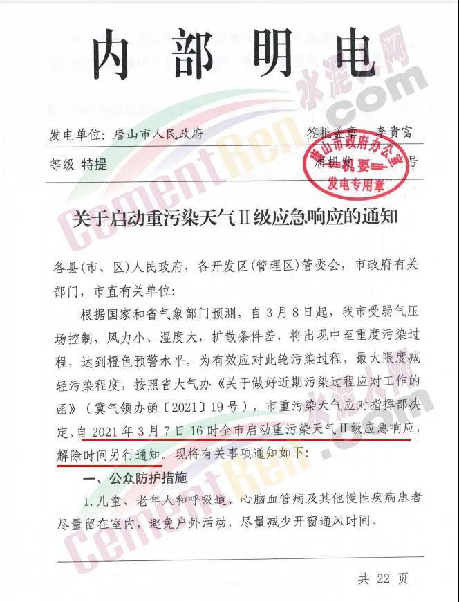 日前,唐山市人民政府发布特提文件《关于启动重污染天气级应急响应的通知》:要求自2021年3月7日16时全市启动重污染天气Ⅱ级应急响应,解除时间另行通知。水泥、钢铁、焦化等企业执行强制性减排措施: