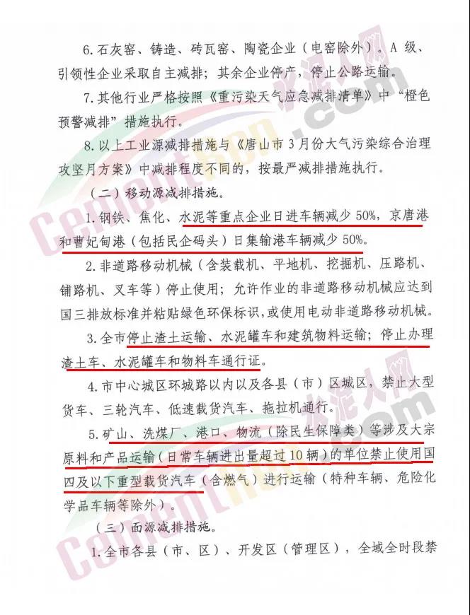钢铁、焦化、水泥等重点企业日进车辆减少50%,京唐港和曹妃甸港(包括民企码头)日集输港车辆减少50%。