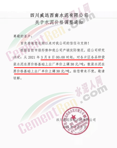 四川威远西南水泥有限公司通知从3月8日00∶00时起,对各片区各品种袋装水泥在原价格基础上出厂单价上调30元/吨;散装水泥在原价格基础上出厂单价上调30元/吨。