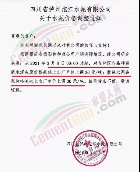 四川省泸州沱江水泥有限公司通知从3月8日00∶00时起,对各片区各品种袋装水泥在原价格基础上出厂单价上调30元/吨;散装水泥在原价格基础上出厂单价上调30元/吨。