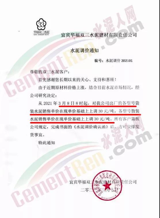 宜宾华福双三水泥建材有限责任公司通知从3月8日8时起,对公司出厂的各型号袋装水泥销售单价在现单价基础上上调30元/吨,各型号散装水泥销售单价在现单价基础上上调30元/吨。