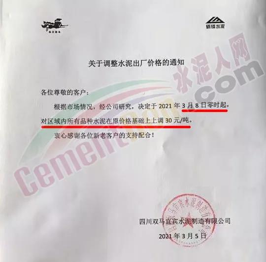 四川双马宜宾水泥制造有限公司通知从3月8日零时起,对区域内所有品种水泥在原价格基础上上调30元/吨。