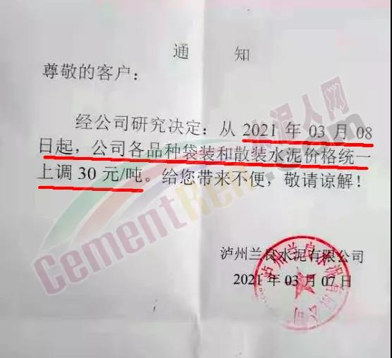 沪州兰良水泥有限公司通知从3月8日起,公司各品种袋装和散装水泥价格统一上调30元/吨。