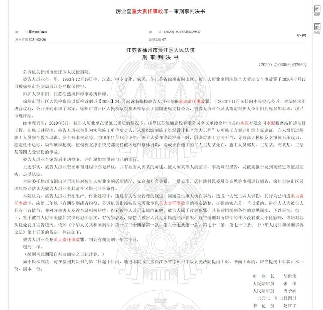2021年2月26日,中国裁判文书网发布了关于这起事故的一审刑事判决书,挂靠的实际施工负责人被判处有期徒刑一年二个月。