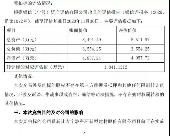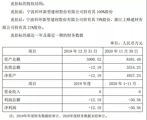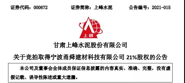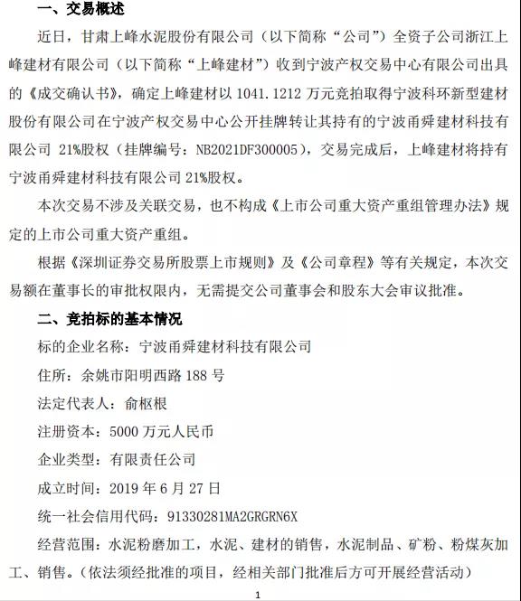 上峰水泥上市公司3月8日发布公告称:近日,公司全资子公司浙江上峰建材有限公司,以1041.12万元竞拍取得宁波科环新型建材股份有限公司在宁波产权交易中心公开挂牌转让其持有的宁波甬舜建材科技有限公司21%的股权。交易完成后,宁波科环持有甬舜建材79%股份,上峰建材持21%的股份。