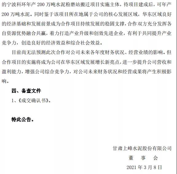上峰水泥表示,该项目所在地属于公司的核心发展区域,华东区域良好的经济基础和发展前景成为合作项目持续发展的稳固支撑,合作双方充分发挥各自资源优势融合共赢,着力打造产业升级和创效先进企业,有利于共同提升产业竞争力,创造良好的经济效益和综合社会效益。