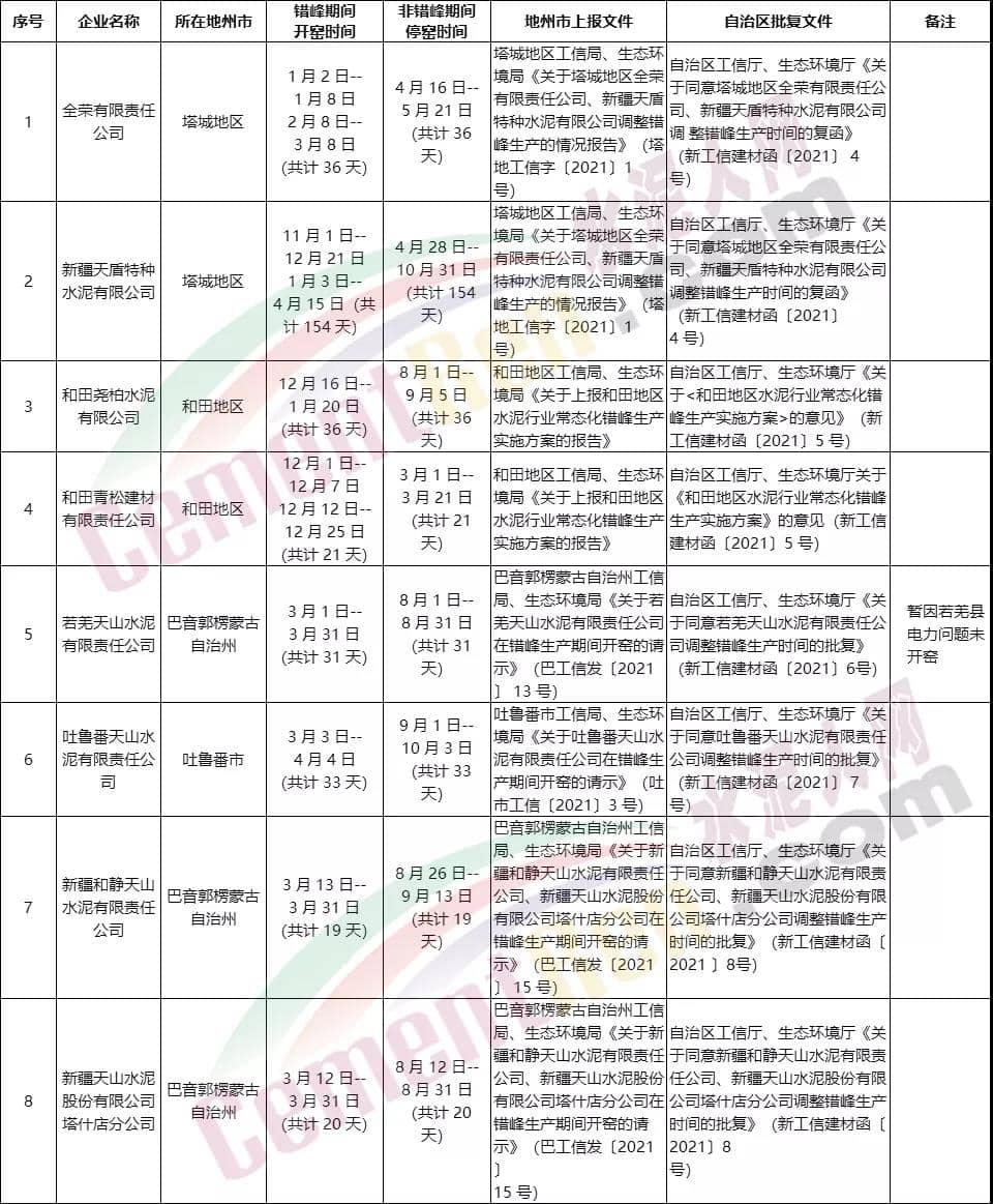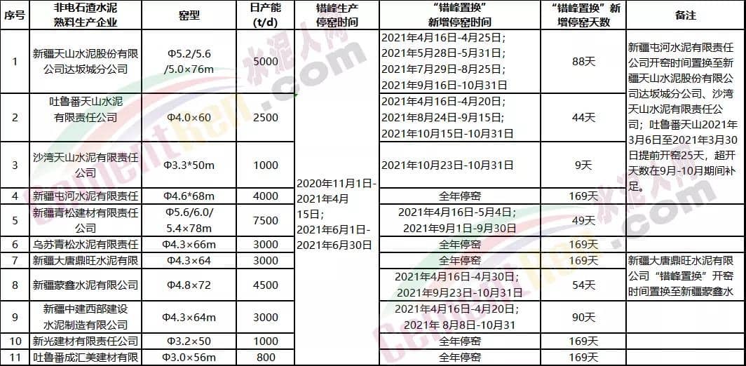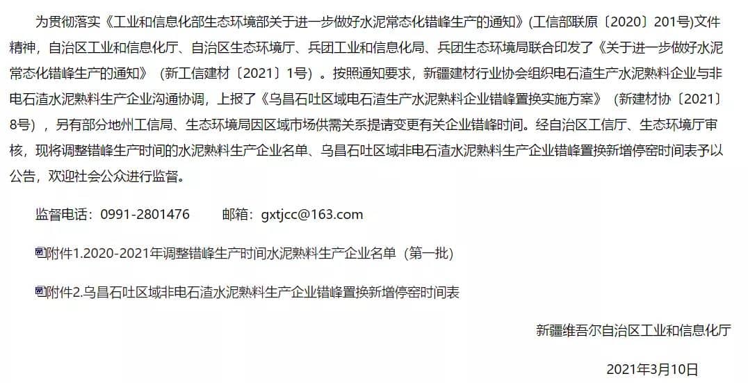日前,新疆维吾尔自治区工业和信息化厅发布《关于对2020-2021年新疆水泥企业调整错峰生产时间及电石渣水泥企业错峰置换情况的公告》。