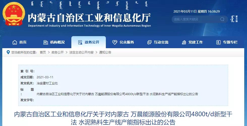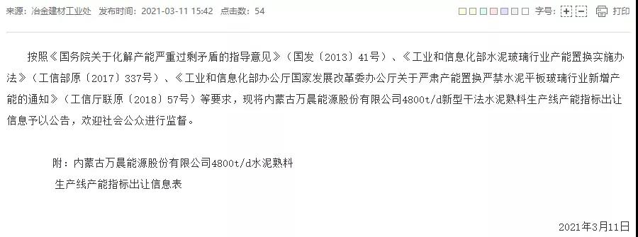 内蒙古工信厅发布《关于内蒙古万晨能源股份有限公司4800t/d新型干法 水泥熟料生产线产能指标出让的公告》将位于内蒙古自治区境内万晨能源股份有限公司4800t/d新型干法水泥熟料生产线产能指标出让。