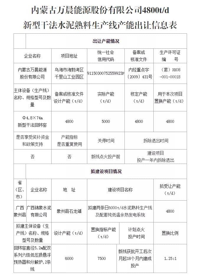 内蒙古万晨能源股份有限公司4800t/d熟料生产线产能指标出让