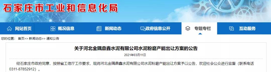 日前,内蒙古工信厅及河北省石家庄工信局分别发布了4800t/d熟料生产退出公示和100万吨/年水泥粉磨产能退出方案。内蒙古自治区退出项目将用于广西壮族自治区境内新建生产线;石家庄金隅鼎鑫退出粉磨产能将用于唐县冀东新建生产线。