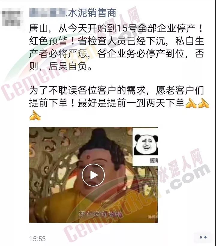 水泥人网通讯员消息:日前有水泥经销商通知,“从12日起到15日河北唐山地区全部企业停产!红色预警!省检查人员已经下沉,私自生产者必将严惩,各企业务必停产到位,否则,后果自负。为了不耽误各位客户的需求,请老客户提前一到两天下单。”