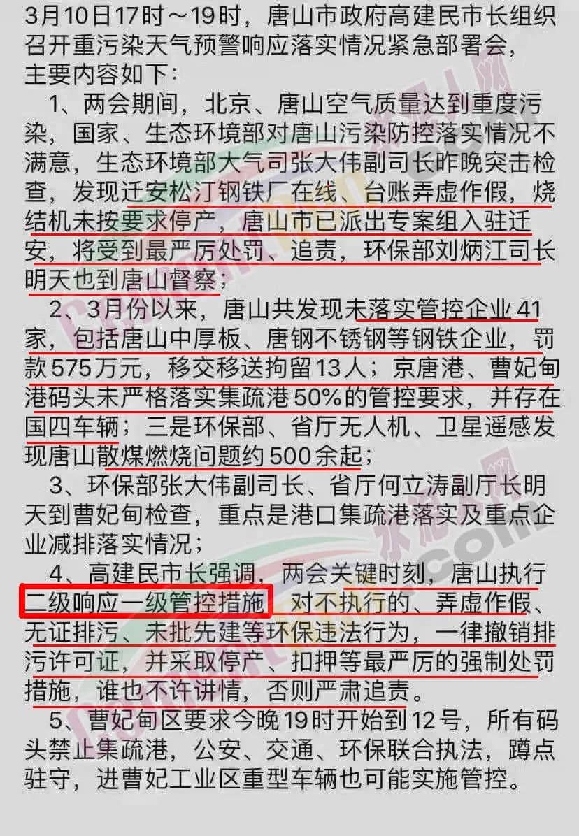 据水泥人网了解,经销商提到的“红色预警”是指,3月10日17时~19时,唐山市政府高建民市长组织召开重污染天气预警响应落实情况紧急部署会时提到的“唐山执行二级响应一级管控措施”要求。